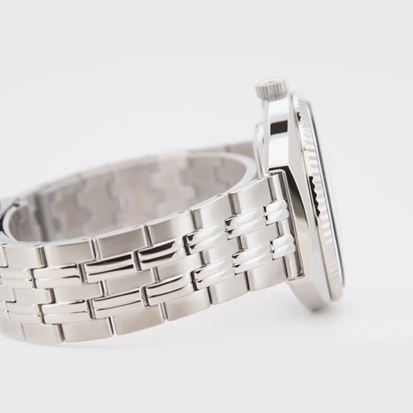 Quadrante blu con finitura omogenea che esalta contrasto e leggibilità, indici applicati e lancette coordinate definiscono un tracciato chiaro, minuteria fine e finestra data compongono un layout ordinato e privo di sovraccarichi. Il cristallo bombato ammorbidisce i contorni, la cassa in acciaio conserva linee continue che favoriscono la pulizia del profilo, mentre il bracciale in acciaio completa la palette fredda. Un’estetica elegante e sobria, adatta a molteplici contesti.