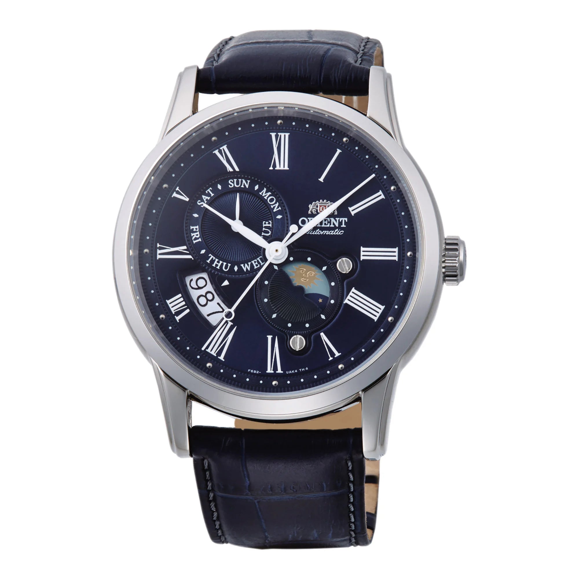 Questi orologi da uomo, espressione di stile, si distinguono per design curato e affidabilità. Parte della rinomata famiglia Sun & Moon, i modelli uniscono maestria artigianale e funzionalità. Al cuore pulsa il movimento meccanico di manifattura, calibro automatico ORIENT F6B24. Dotato di 22 rubini, offre carica automatica, possibilità di ricarica manuale e funzione di hacking per una regolazione precisa dell'ora. L’accuratezza giornaliera dichiarata è compresa tra +25 e -15 secondi. Tra le caratteristiche distintive, la complicazione che mostra giorno e data insieme al ciclo del sole e della luna, elemento che richiama il gusto per i segnatempi classici. Le casse, robuste e resistenti, sono realizzate in acciaio inossidabile con forma rotonda. Le dimensioni, 42 mm di diametro e 14 mm di spessore, conferiscono una presenza decisa ma equilibrata. A protezione dei quadranti, cristalli zaffiro garantiscono resistenza ai graffi, mentre corone a pressione e fondelli a vite con apertura trasparente offrono uno sguardo sul movimento. Con resistenza all'acqua fino a 50 metri, i modelli risultano adatti all’uso quotidiano. La sicurezza al polso è assicurata da chiusure pieghevoli con pulsante (deployante), pensate per praticità e comfort. Orologi classici e versatili, rappresentano un dress watch adatto a chi cerca un accessorio che combini tradizione, estetica sobria e buona qualità. I segnatempi vengono consegnati nella confezione ORIENT, accompagnati da manuale d'istruzioni e garanzia internazionale ORIENT di 2 anni, a riprova dell’impegno verso affidabilità e servizio. Orologi automatici accompagnati da accessori maschili che celebrano storia e innovazione.
