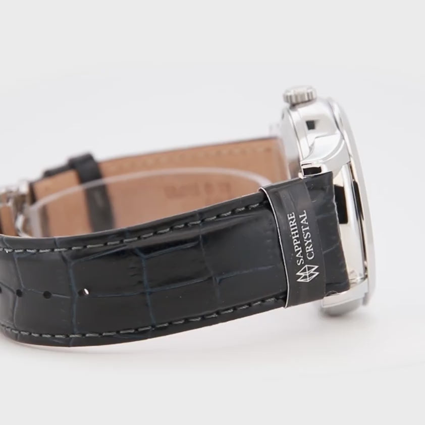 Quadrante blu profondo con resa omogenea, indici applicati e lancette coordinate assicurano chiarezza, l’indicatore Sun & Moon introduce movimento visivo, con giorno e data a scandire lo spazio con ordine. Il vetro zaffiro mantiene la nitidezza, la cassa in acciaio bilancia linee e volumi, il cinturino in pelle tono su tono rafforza la continuità cromatica. Ne deriva un insieme armonico e attuale, curato nei dettagli e facile da abbinare dal giorno alla sera.