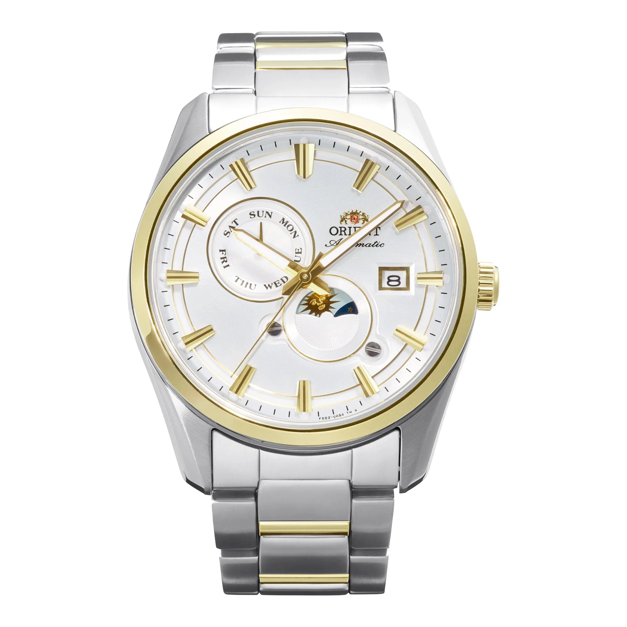 Esplora la collezione Contemporary, dove eleganza quotidiana e ingegneria di precisione si incontrano. Questi orologi da polso coniugano qualità affidabile e design curato, rivolgendosi a chi apprezza uno stile maschile sobrio e versatile. I modelli Sun & Moon si distinguono per l’affascinante indicazione giorno/notte, una complicazione che aggiunge carattere al quadrante e accompagna giorno e data in un layout ordinato. Al cuore dei segnatempi opera il calibro automatico F6B24 con 22 rubini, carica automatica e manuale e funzione di hacking (fermo macchina) per una regolazione precisa dell’ora; la precisione dichiarata è +25/−15 secondi al giorno. Le casse rotonde in acciaio inossidabile misurano 42 mm di diametro e 13 mm di spessore, proporzioni che garantiscono presenza al polso senza rinunciare alla vestibilità. Il vetro zaffiro protegge il quadrante e favorisce la leggibilità nel tempo. La corona a pressione rende l’uso intuitivo, mentre il fondello a vite con oblò trasparente permette di osservare il movimento in azione. Con WR 50 m, i modelli risultano adatti all’uso quotidiano, resistendo a spruzzi e contatti occasionali con l’acqua. La chiusura è una pieghevole con pulsante (deployante), scelta che combina praticità e tenuta al polso. L’insieme restituisce uno stile casual-elegante facilmente abbinabile, per passare dal lavoro al tempo libero con coerenza estetica. I segnatempi vengono consegnati nella ORIENT box, accompagnati da garanzia internazionale ORIENT di 2 anni e manuale d’uso. Una proposta che unisce funzioni utili e un design riconoscibile: le referenze Sun & Moon offrono un automatico affidabile, curato nei dettagli e pensato per durare nel quotidiano.