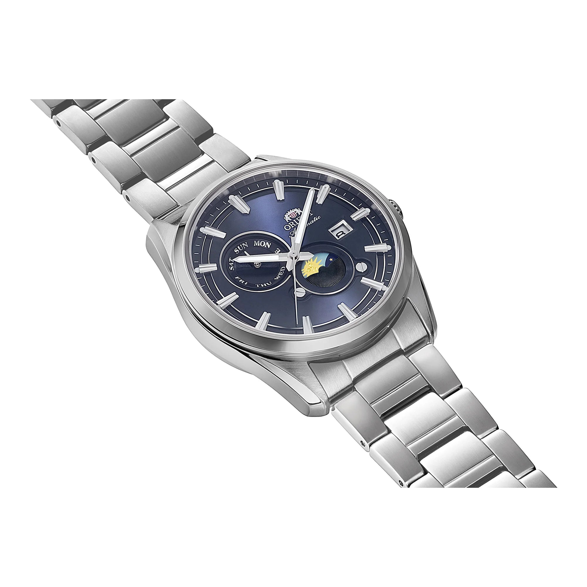 Complicazione giorno/notte al centro del progetto, con un disco illustrato che accompagna lo scorrere delle ore. Il quadrante adotta una disposizione a più contatori per data e giorno, mantenendo ordine e leggibilità. Indici applicati o numeri romani, minuteria precisa e sfere affusolate definiscono un linguaggio classico. Finiture radiali o sfumate aggiungono profondità, mentre cinturini in pelle e bracciale in acciaio ampliano le possibilità di abbinamento.