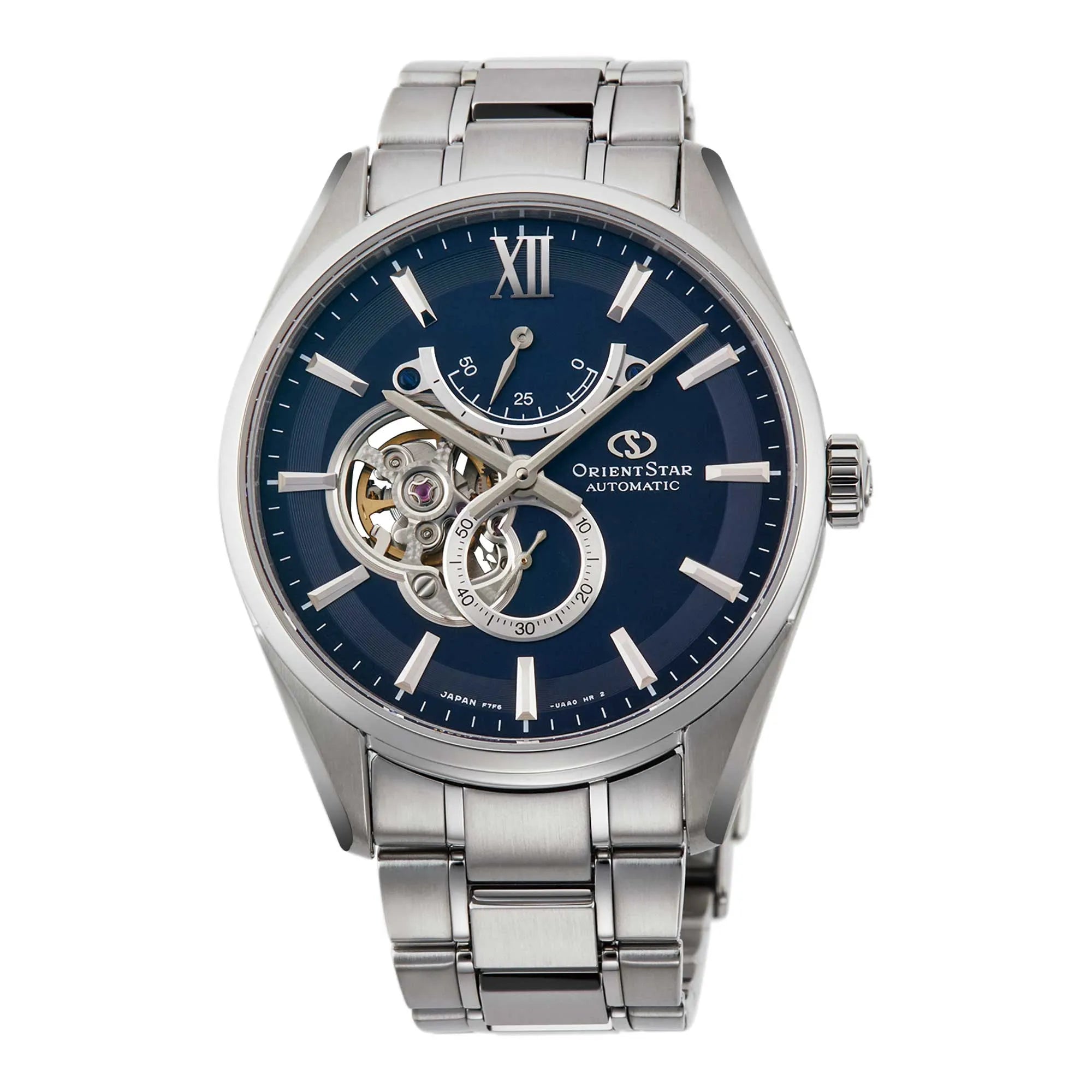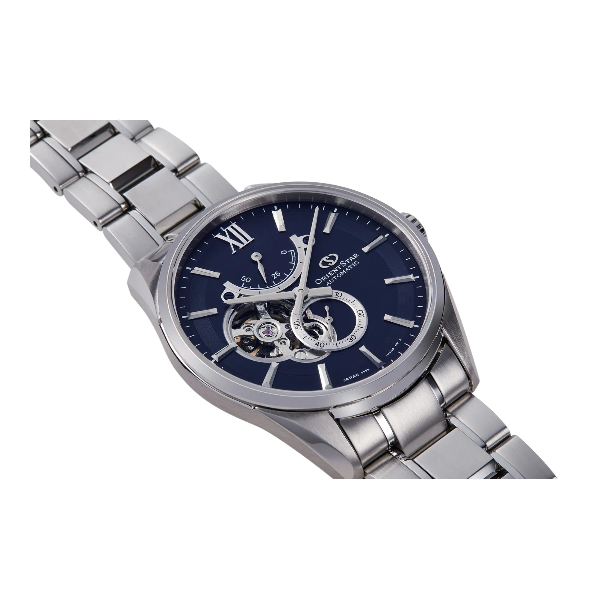 Quadrante blu con apertura generosa che lascia affiorare la meccanica, indici applicati e lancette coordinate sotto zaffiro. La cassa in acciaio si raccorda al bracciale a finitura mista, creando continuità visiva. Un’interpretazione elegante del tema skeleton, curata nei contrasti e nella pulizia del disegno.