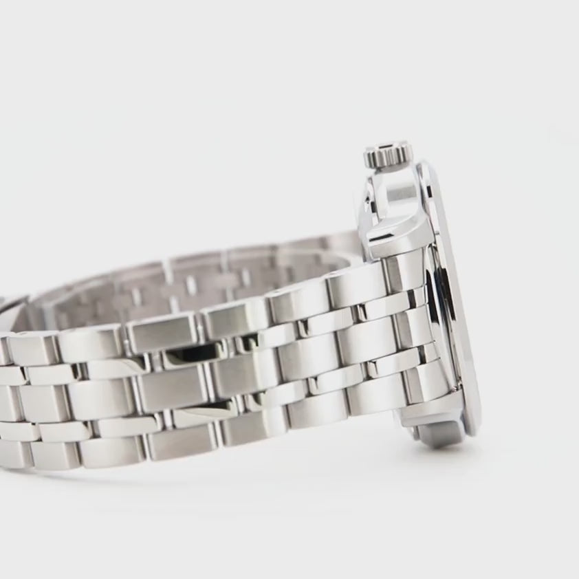 Architettura multilivello che alterna piani e cornici, con aperture centrali calibrate a svelare la meccanica senza sacrificare la lettura, indici applicati sottili e lancette coordinate tengono saldo l’equilibrio grafico, mentre la scala perimetrale guida lo sguardo con regolarità. Il vetro zaffiro assicura nitidezza, la cassa in acciaio alterna lucido e satinato con misura, il bracciale prosegue la continuità materica. Un’estetica strutturata e moderna, ordinata nella complessità.