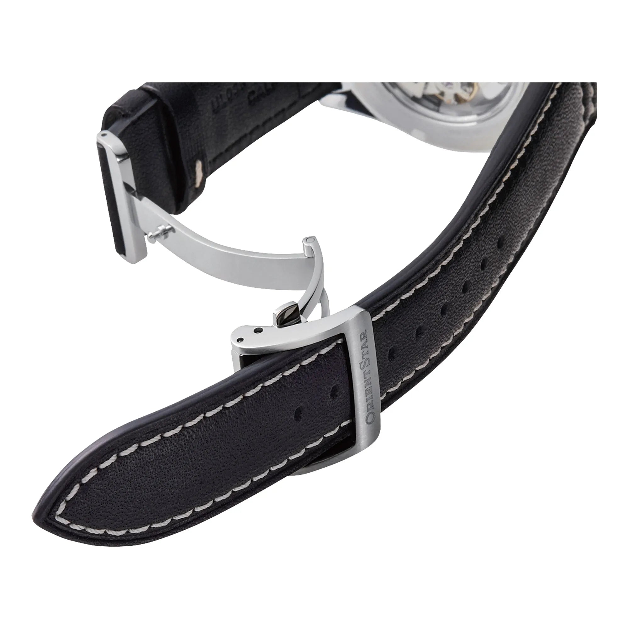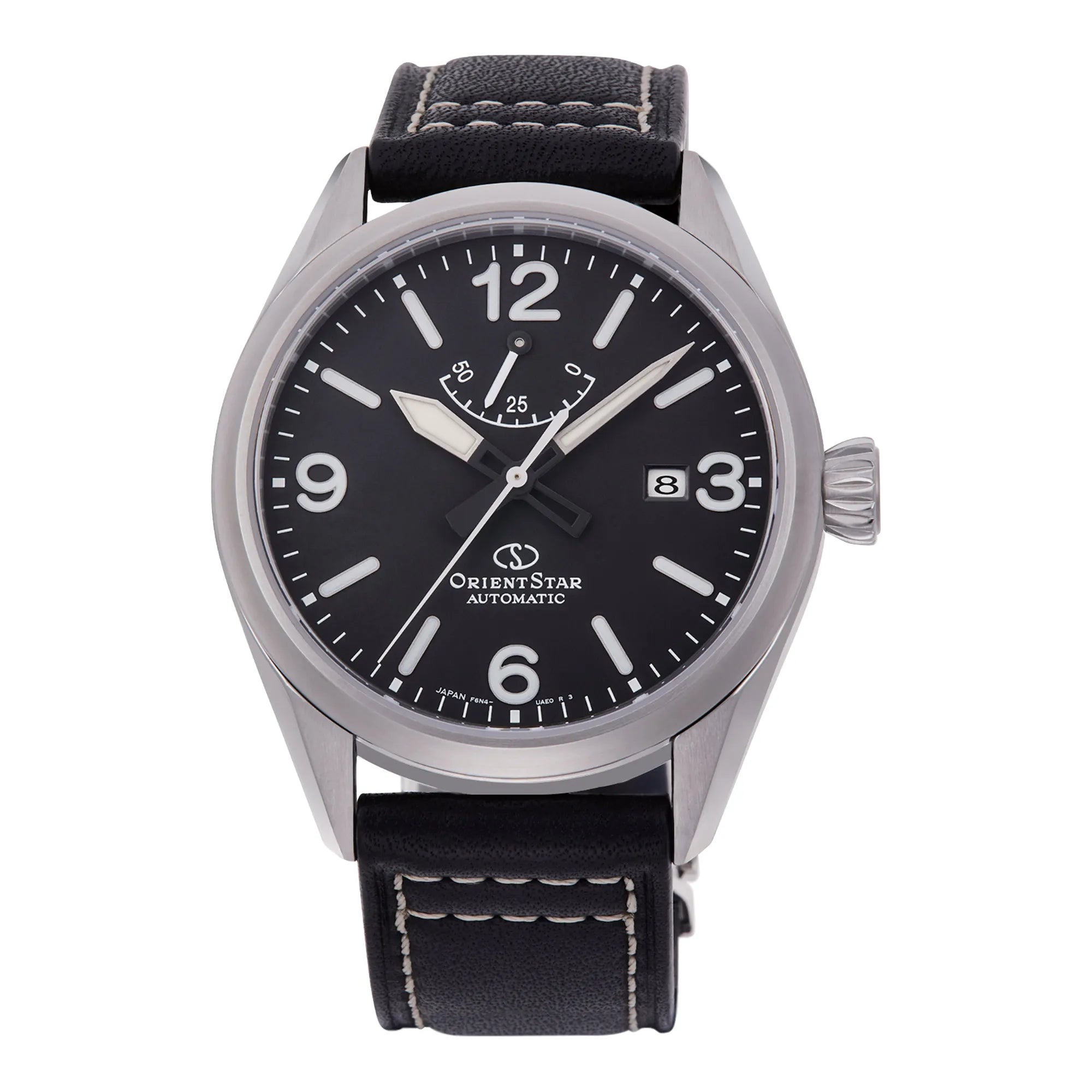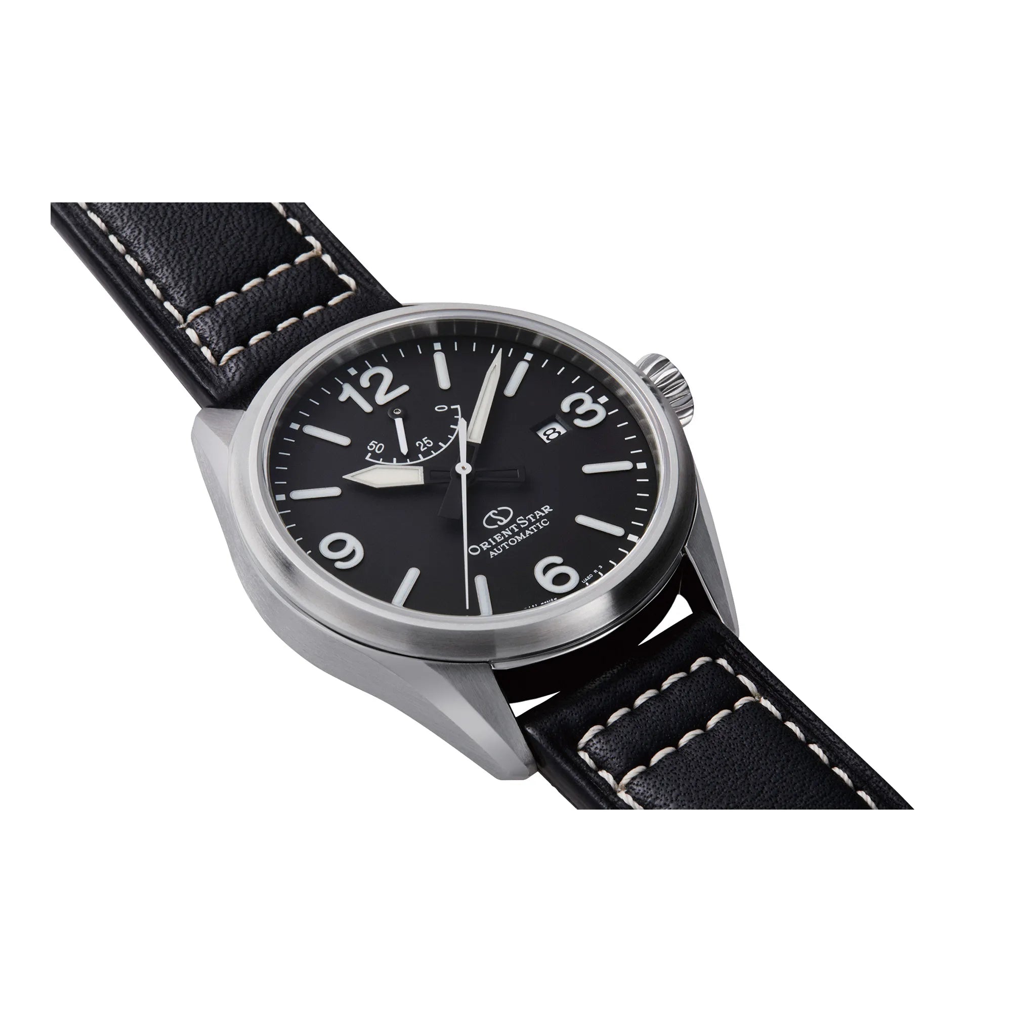 Questo orologio ORIENT STAR Sport Outdoor è un esemplare di alta qualità di tipo field watch. La corona ampia a forma di crisantemo è utilizzabile facilmente anche con i guanti. Il quadrante nero è di facile lettura grazie ai numeri arabi dotati, come le sfere, di luminescenza per visione notturna. Completa il quadro un robusto cinturino in vera pelle nera.