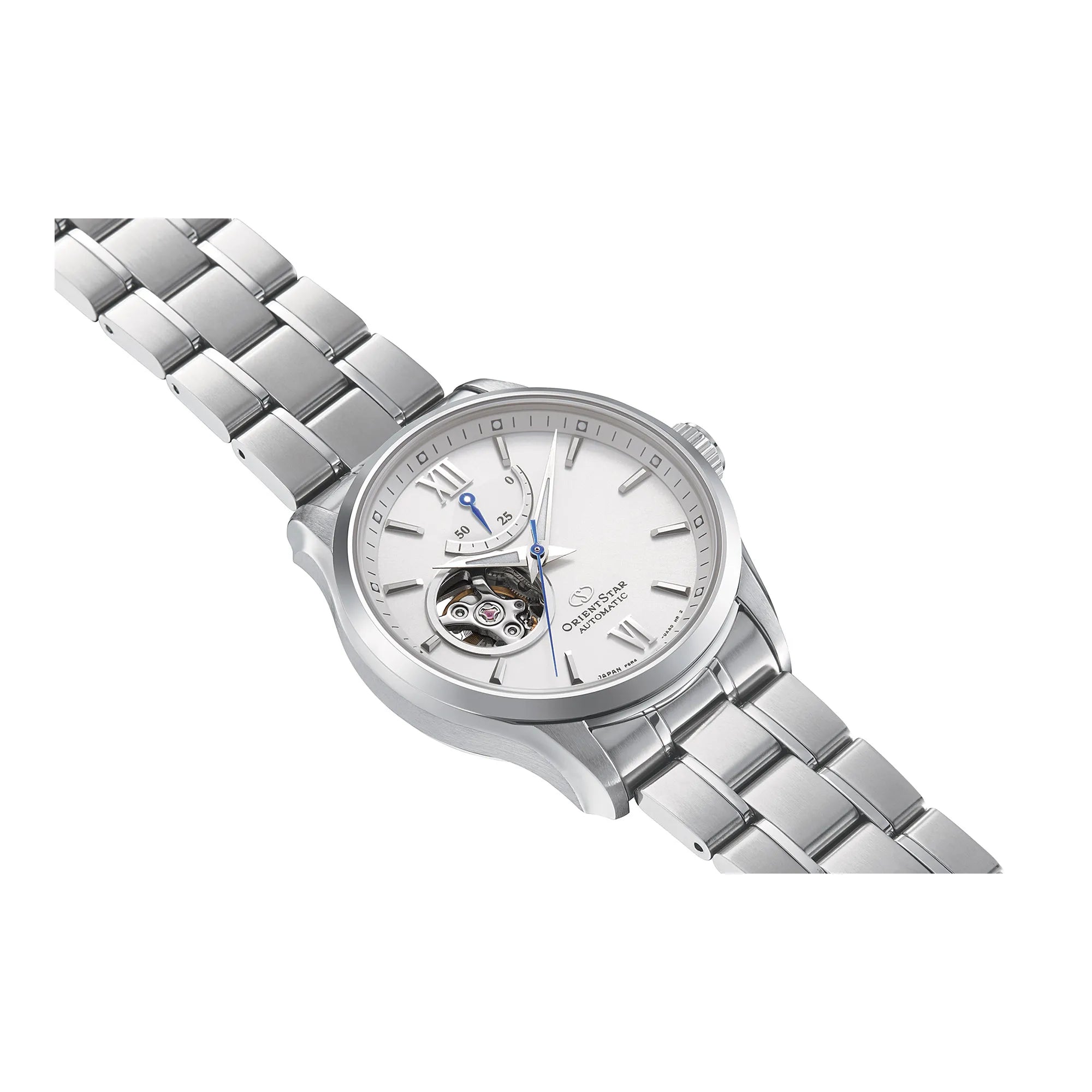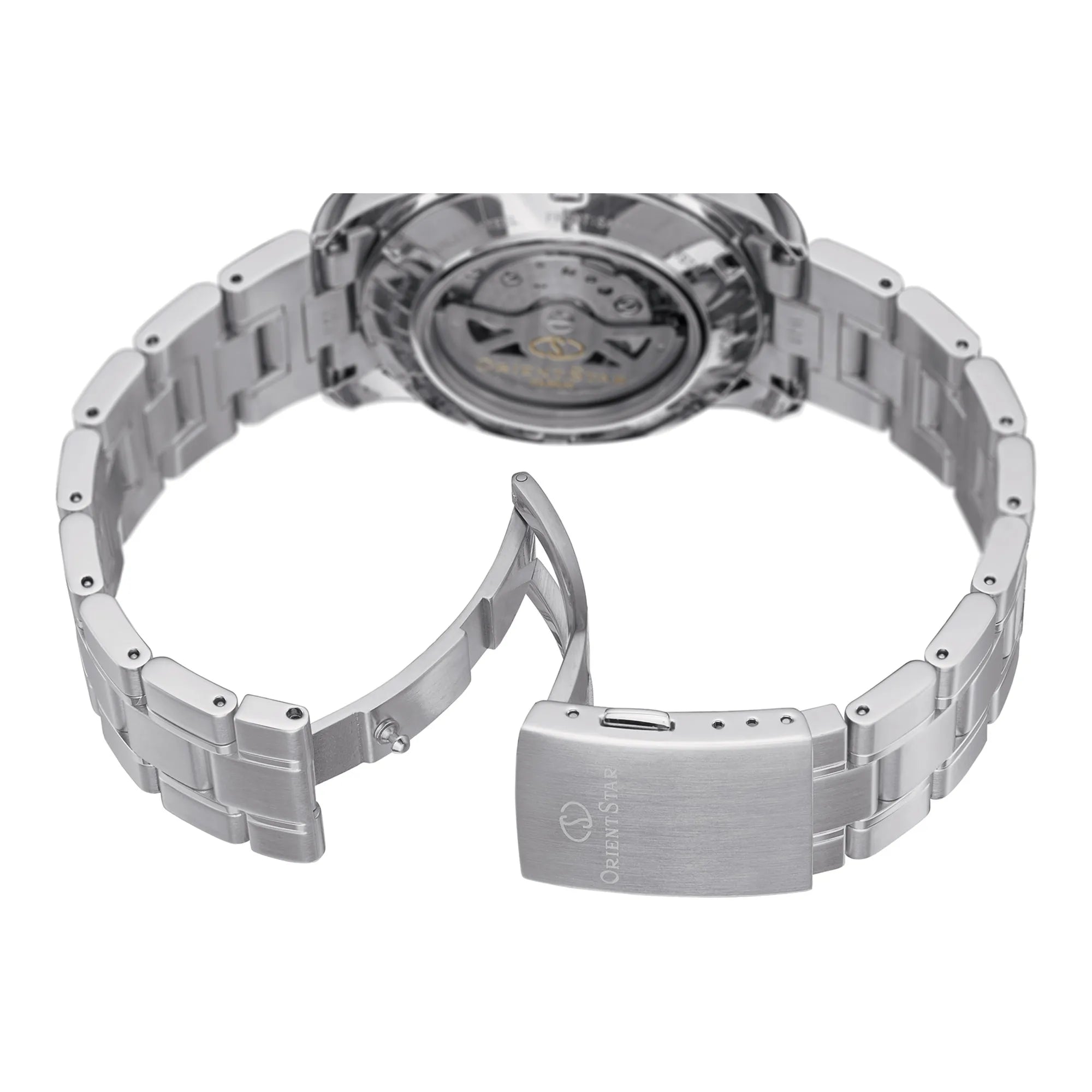 Anima meccanica a vista in chiave contemporanea: l’apertura sul lato sinistro del quadrante mostra il bilanciere, mentre l’indicatore di riserva di carica in alto aggiunge funzionalità e ritmo visivo. Il disegno a più livelli con finiture radiali crea profondità e mantiene ordine, con indici e lancette trattati Luminous Light per una lettura chiara. Vetro zaffiro con trattamento antiriflesso e fondello trasparente sottolineano la cura costruttiva;i cinturini in pelle completano un’estetica elegante ma decisa.