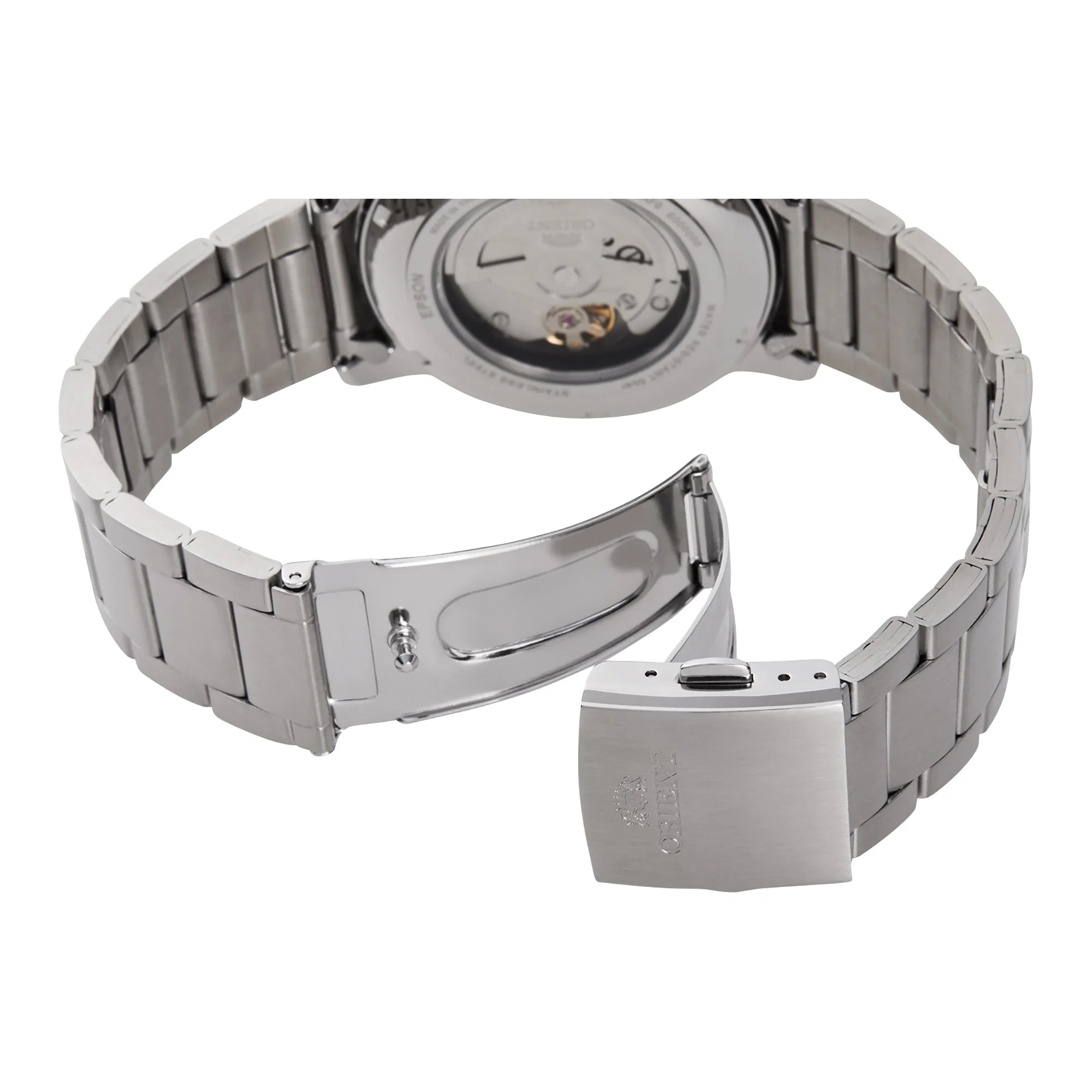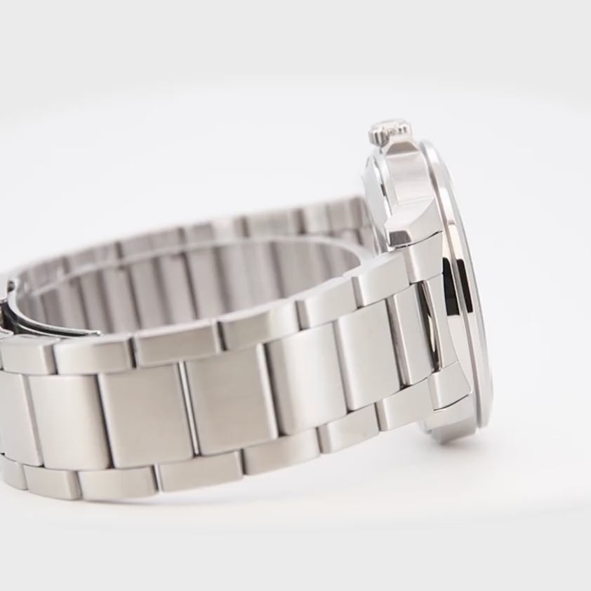 Quadrante chiaro a resa uniforme che privilegia ordine e leggibilità, con indici applicati e lancette coordinate sotto vetro minerale, la data è incorniciata con misura, la minuteria sottile scandisce il perimetro. La cassa in acciaio adotta fondello trasparente per un accenno alla meccanica, mentre il bracciale in acciaio garantisce continuità e solidità visiva. Un’estetica sobria e luminosa, costruita su proporzioni visive equilibrate e finiture ordinate.