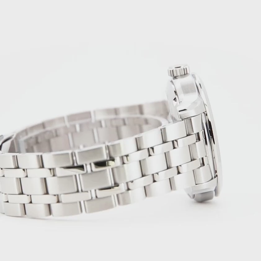 Tonalità scure che incontrano livelli sovrapposti in un impianto deciso: i vuoti centrali creano profondità senza confusione visiva, mentre indici applicati e lancette coordinate presidiano ritmo e leggibilità, la scala perimetrale aggiunge precisione. Il vetro zaffiro mitiga i riflessi, la cassa in acciaio enfatizza i volumi con passaggi satinati, il bracciale a finitura mista compatta l’insieme. Un profilo tecnico-contemporaneo, definito ma misurato.