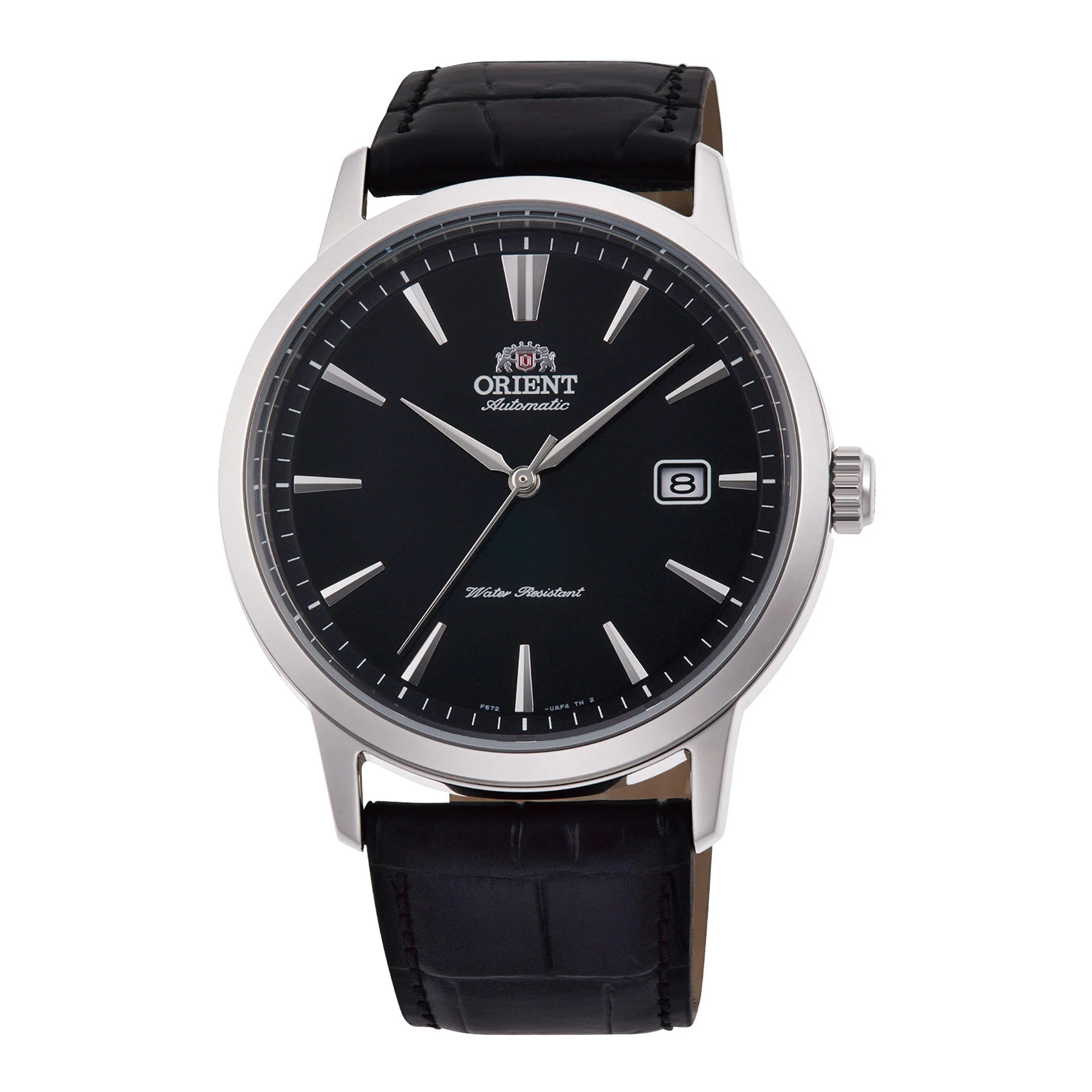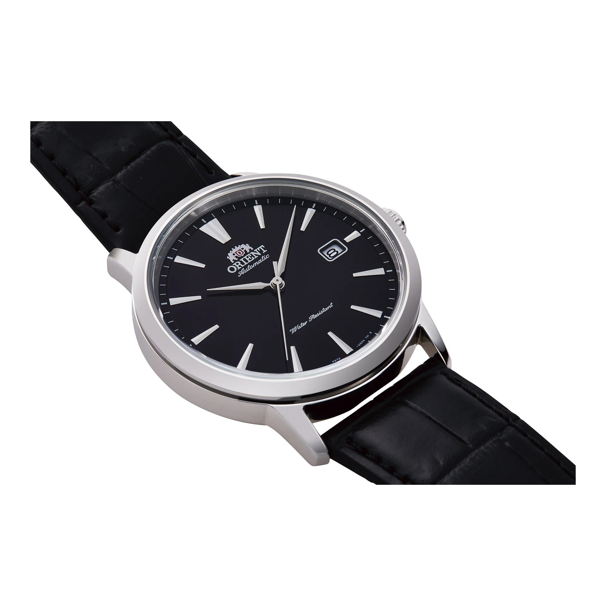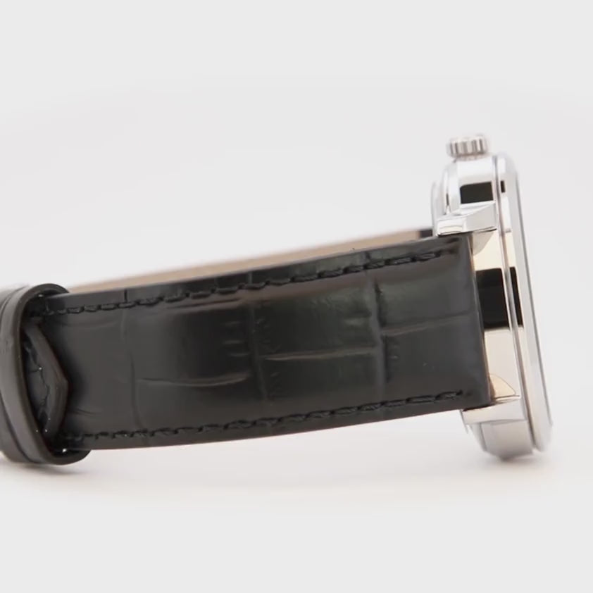 Quadrante nero profondo con finitura uniforme, indici applicati e lancette coordinate a contrasto, vetro bombato per profondità, data a ore 3 con cornice discreta. La cassa in acciaio lucida mette in risalto i giochi di luce, il cinturino in pelle nera conferma il carattere formale. Un insieme essenziale e deciso, con leggibilità immediata e dettagli misurati.
