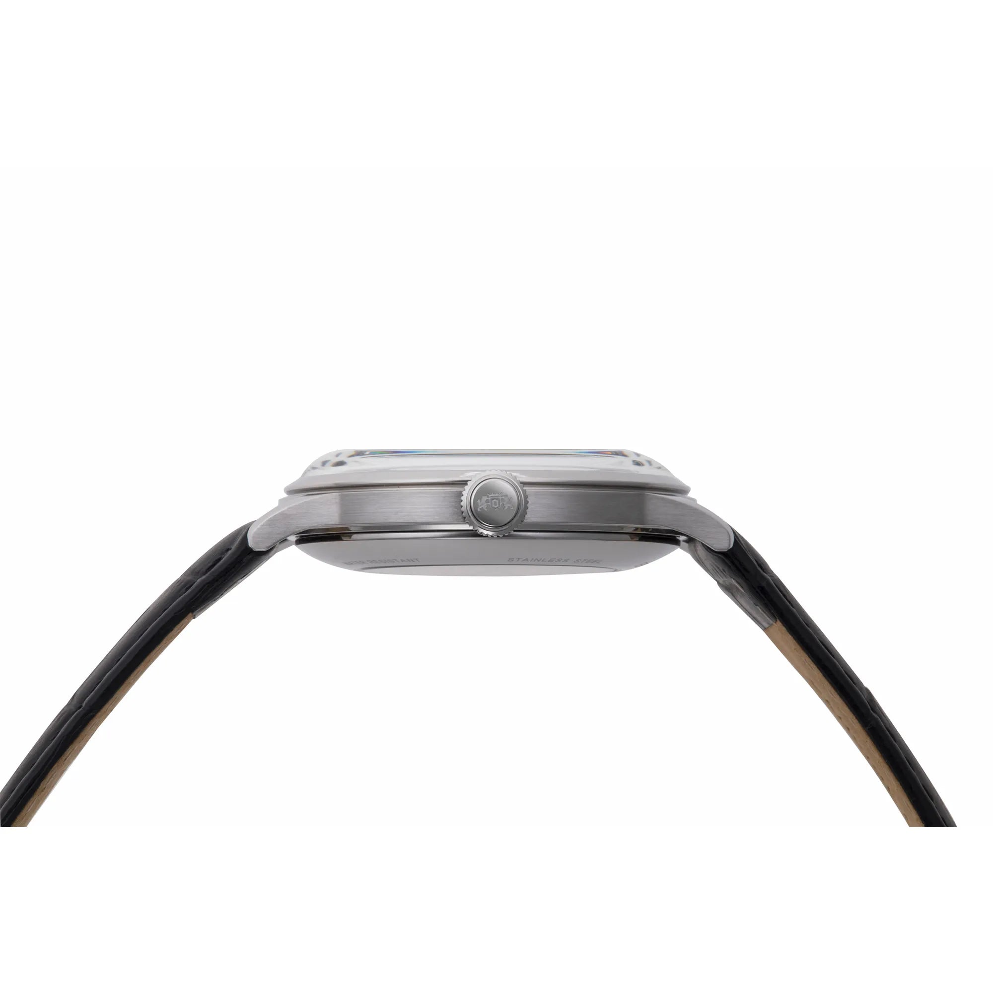 Protagonista è l’open heart: la finestra sul quadrante svela il bilanciere e aggiunge ritmo visivo a ogni secondo. L’impianto resta quello del classico orologio da abito, con vetro bombato, quadrante leggermente curvo e indici ordinati per una lettura pulita. Finiture radiali e contrasto lucido/satinato enfatizzano la profondità della scena, mentre i cinturini in pelle completano un insieme elegante con una nota meccanica dichiarata.