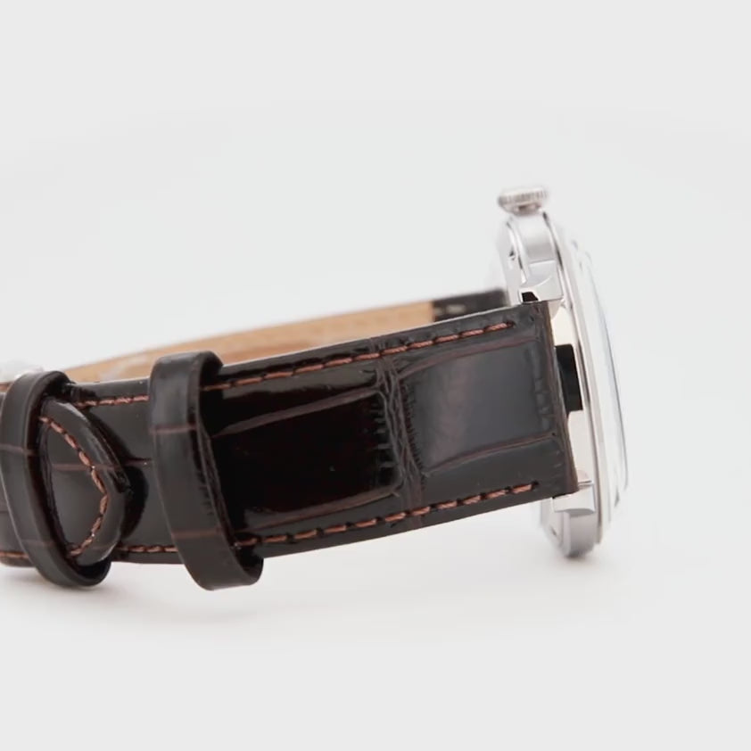 Un classico da abito in chiave rétro: vetro bombato e quadrante curvo dialogano con una grafica a numeri romani e minuteria chemin de fer, dettagli che richiamano i segnatempo da cerimonia. Sfere affusolate e proporzioni bilanciate favoriscono una lettura pulita, mentre la finestra data si integra con discrezione. Cinturini in pelle ampliano le combinazioni, dalle tonalità formali ai toni caldi di nuova ispirazione. Finiture lucide e satinate ne accentuano il profilo, comodo sotto il polsino.