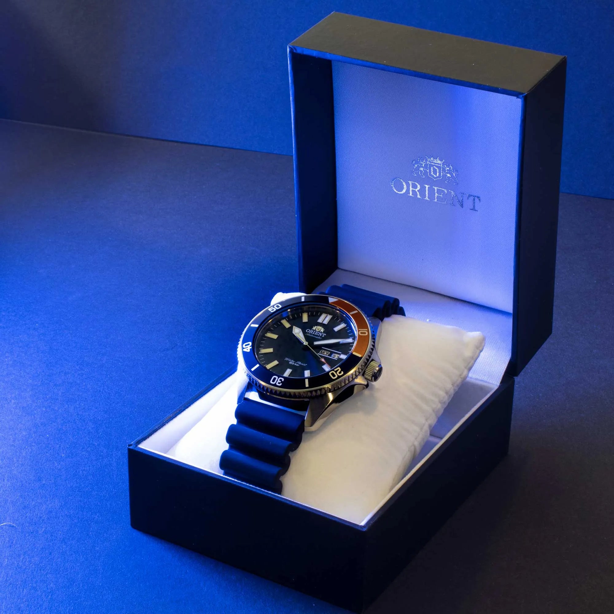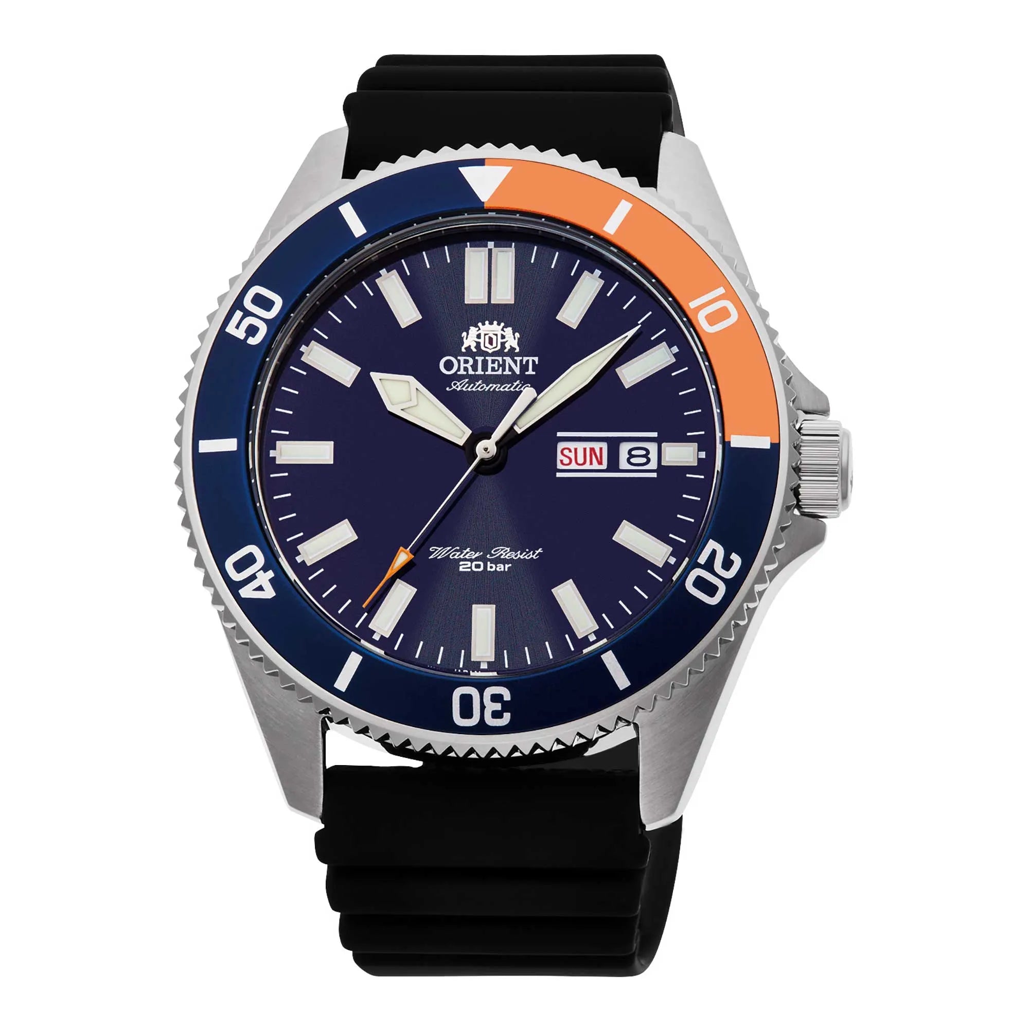Modello portabandiera della collezione ORIENT Sport e figlio maggiore della famiglia Diver, si distingue per le maggiori dimensioni rispetto al Mako e al Kamasu, è adatto ad ogni occasione avventurosa o metropolitana. Qui in variante con cinturino in morbido silicone nero e combinazione blu notte e arancio fiamma di quadrante e ghiera.