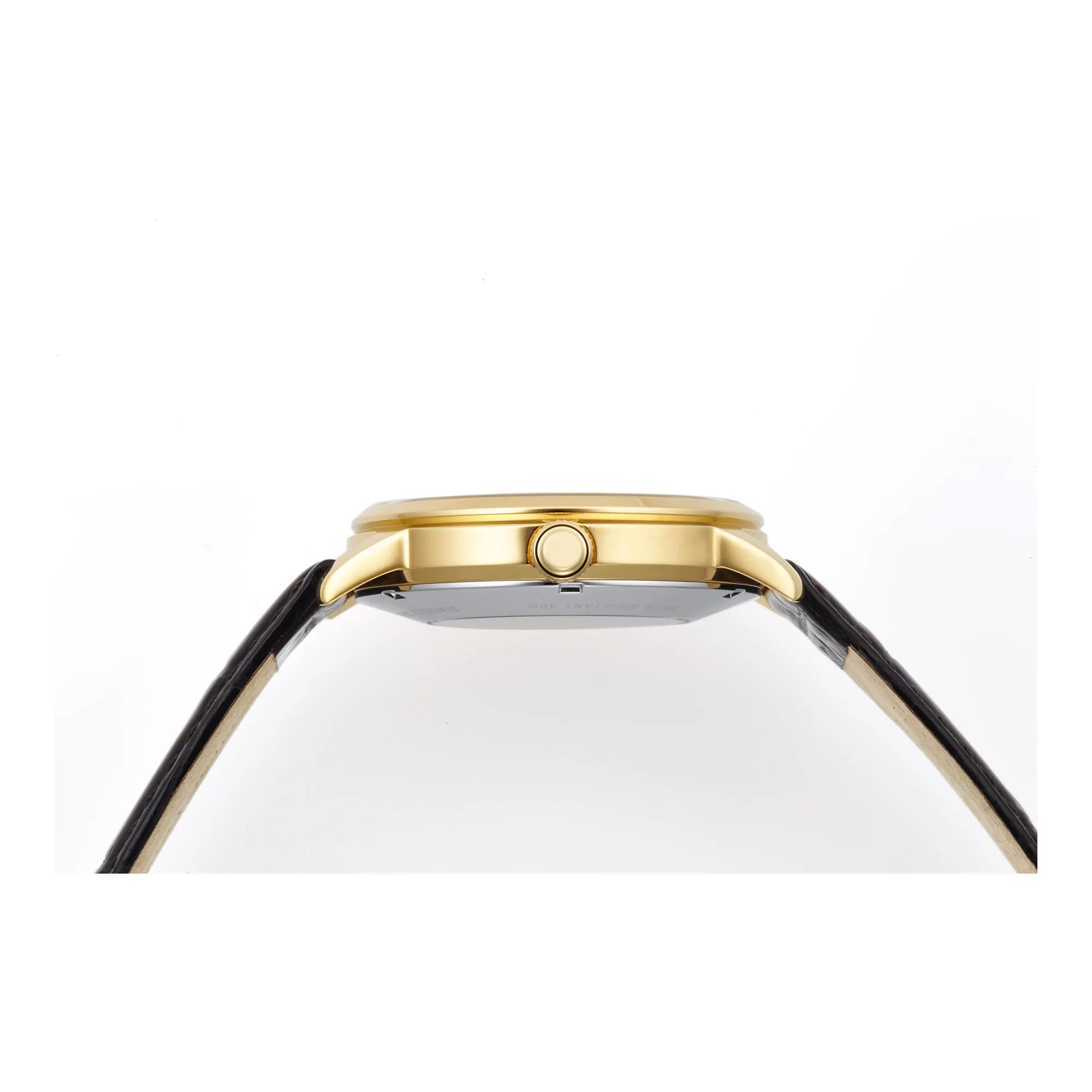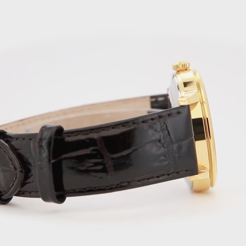 Quadrante chiaro con finestra sul bilanciere, indici applicati e lancette coordinate sotto vetro bombato bilanciano luce e contrasto, la minuteria sottile mantiene pulizia grafica. La cassa in acciaio a finitura oro giallo, con fondello a vista, dialoga con un cinturino in pelle marrone, definendo un tono classico e rifinito. Il risultato è elegante e tradizionale, con un accento tecnico ben definito ma misurato, che valorizza la profondità del quadrante senza sovraccaricarlo.