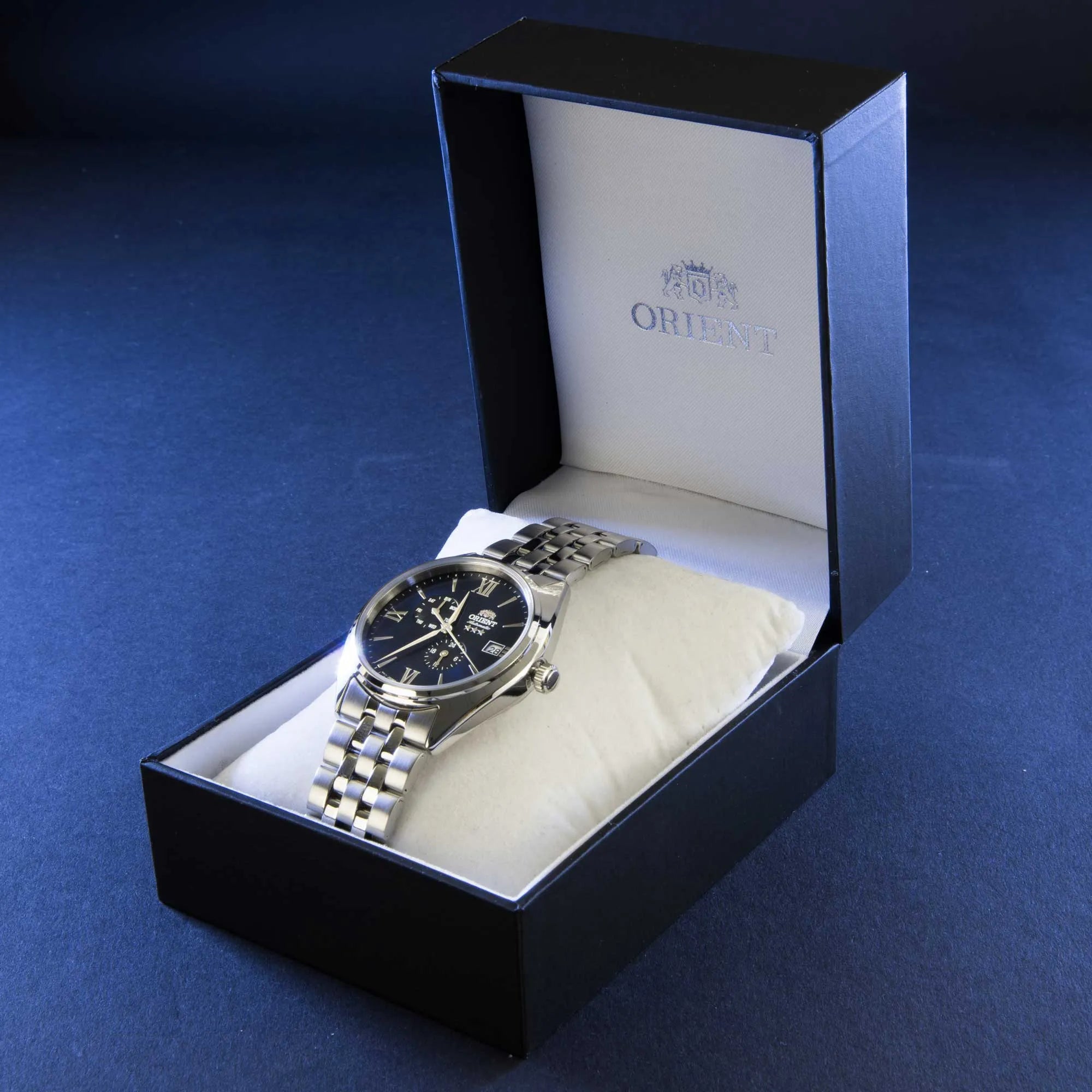 Scopri la leggendaria collezione 3 Star di ORIENT, un’icona di affidabilità e stile che ha attraversato le generazioni mantenendo intatta la sua identità. Ogni modello di questa linea rappresenta la filosofia del marchio, orientata alla precisione, alla durabilità e alla cura dei dettagli. Un segnatempo che unisce estetica classica e prestazioni solide, ideale per accompagnare ogni momento della giornata.La cassa rotonda in acciaio inossidabile, dal diametro di 37 mm e spessore di 11 mm, offre proporzioni equilibrate e un comfort ottimale al polso. Il vetro minerale protegge il quadrante, mentre la corona a pressione consente una regolazione agevole. La resistenza all’acqua ne conferma l’affidabilità nell’uso quotidiano, rendendolo adatto a diverse situazioni.Il movimento automatico ORIENT Calibro F4902, con 21 rubini, garantisce una precisione stimata di +25/-15 secondi al giorno e un funzionamento costante. Questo meccanismo meccanico si ricarica con il naturale movimento del polso, eliminando la necessità di batterie. Il quadrante, con visualizzazione a tre lancette, integra il doppio calendario con indicazione di giorno e data, un dettaglio pratico e funzionale che ne valorizza l’utilità quotidiana. La leggibilità è garantita anche in condizioni di scarsa illuminazione grazie agli indici e alle lancette con trattamento luminescente. Il cinturino in acciaio, largo 19 mm e adatto a polsi fino a 19 cm, è dotato di chiusura deployante pieghevole che assicura stabilità e comfort. Con il suo design sobrio e intramontabile, il modello 3 Star si adatta con naturalezza a stili sia formali che casual, mantenendo sempre un tocco di eleganza essenziale.Un orologio automatico pensato per chi apprezza la qualità costruttiva e la tradizione di ORIENT, capace di coniugare funzionalità e fascino vintage. Un segnatempo affidabile e senza tempo, perfetto per chi cerca un compagno duraturo e dallo stile autentico.