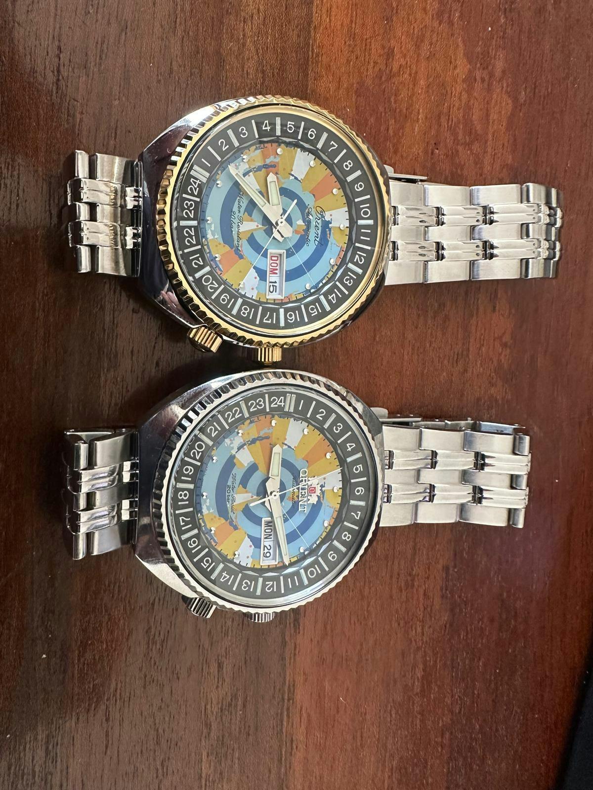 Il quadrante multicolore con mappa del mondo al centro definisce un’icona riproposta dalla collezione Revival con specifiche attuali. L’estetica discende dagli storici modelli da viaggio degli anni Sessanta, che univano vocazione sub e funzione world time semplificata tramite ghiera interna ruotabile. Cassa bicolore con dettagli dorati, logo storico in corsivo e fondello inciso; bracciale integrato e indicazioni di giorno e data completano una proposta dal carattere collezionistico.